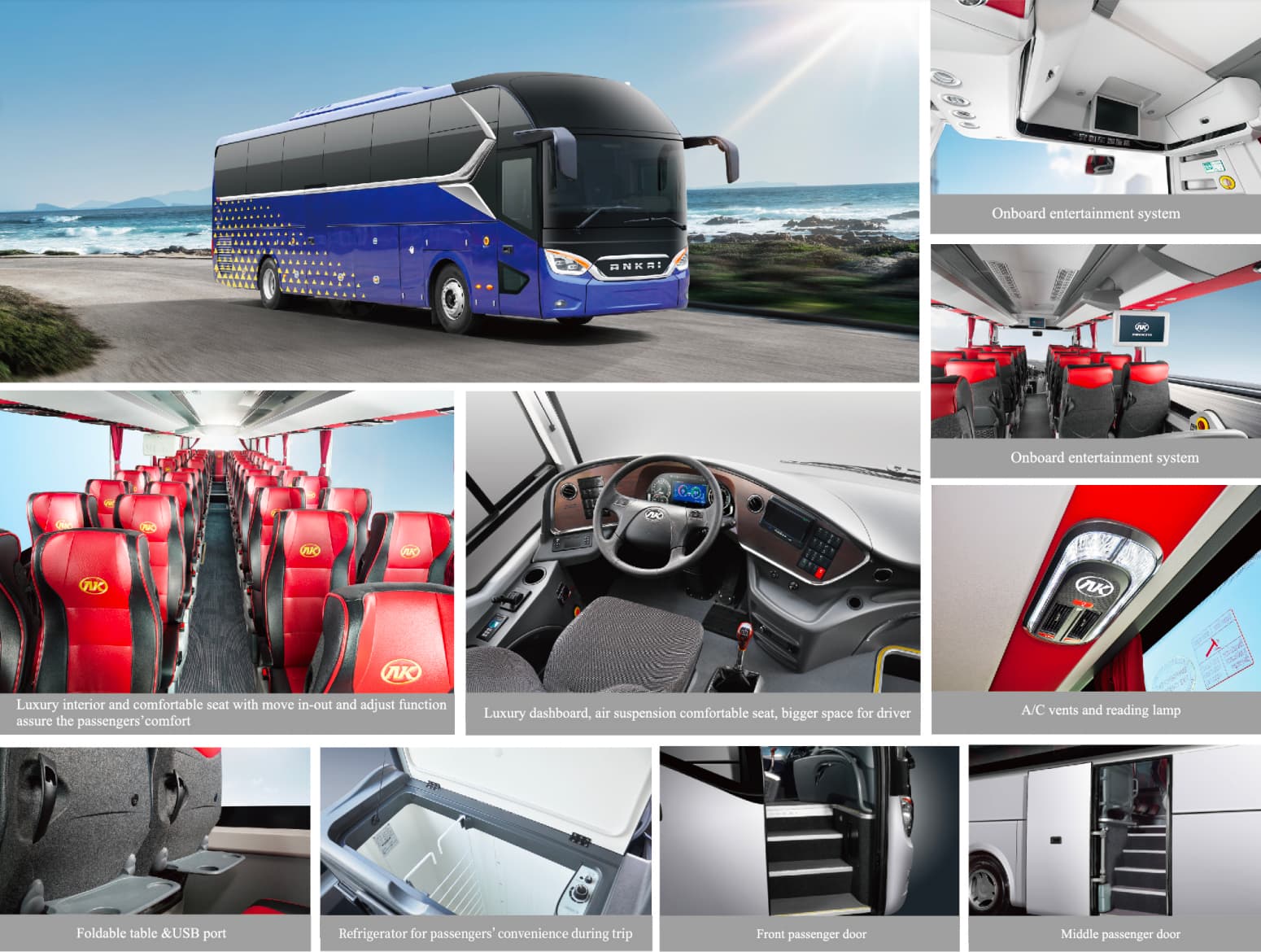 The Ankai A-Series Coach Bus—including the flagship A12 and the compact A6—is engineered for long-distance tourism, business travel, and premium passenger transportation. With modern exterior styling, ergonomic seating, and advanced onboard comfort systems, the A-Series delivers high reliability, low operating costs, and exceptional ride quality. Designed to meet Euro V emission standards, the A-Series combines safety, luxury, and durability for operators seeking dependable fleet performance.